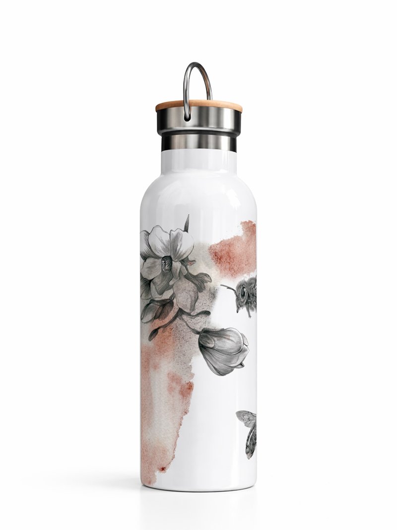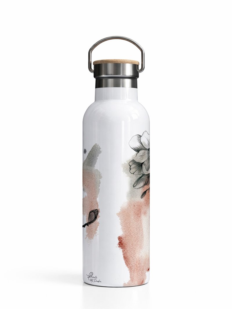 Botella térmica de acero inoxidable (500 ml) con diseño artístico exclusivo, apta para consumo alimentario. Conserva las bebidas frías durante 8 horas y calientes durante 6 horas. Ligera, sin condensación y elaborada artesanalmente en edición limitada, firmada y pensada para acompañarte cada día.